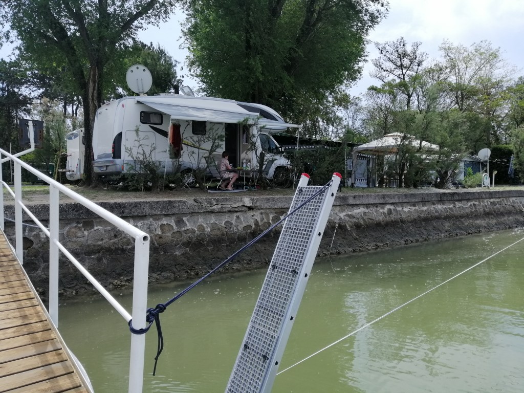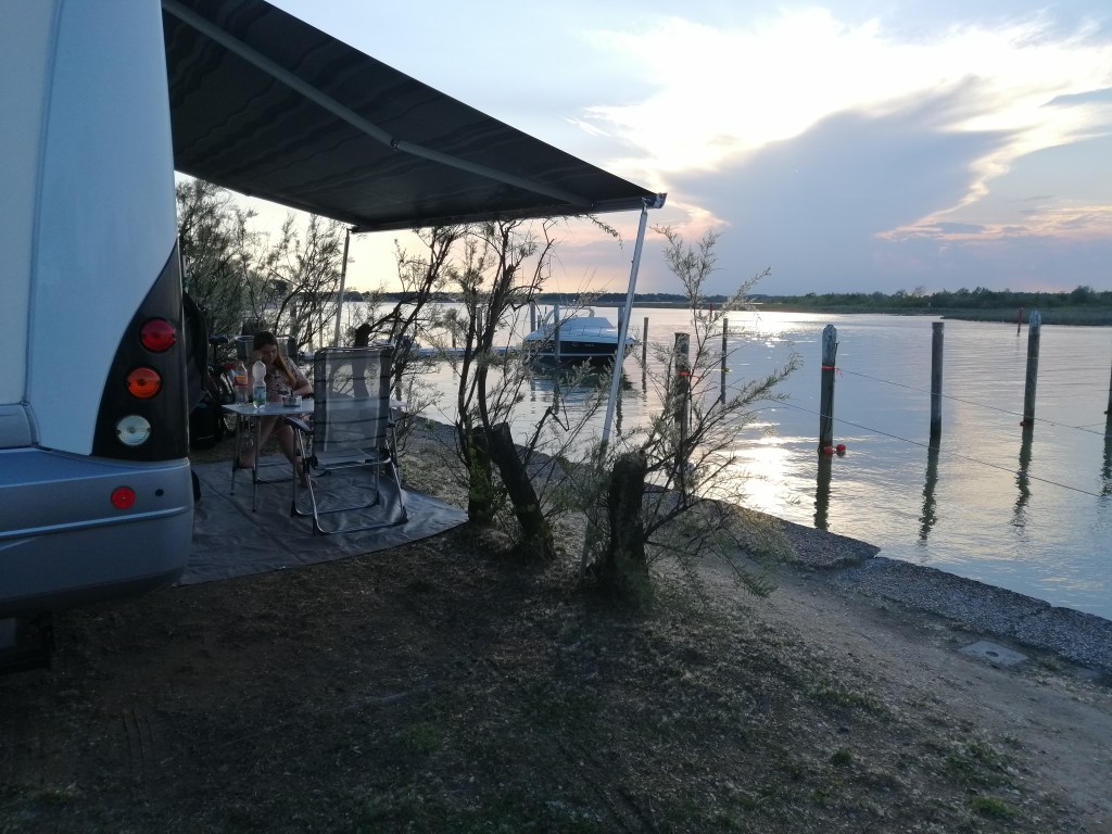 Durch den stark einsetzenden Urlaubsverkehr ging es nur zäh voran, so zeigte die Uhr beinahe 15 Uhr, als wir das Ortsschild Bibione erreichen. Im Vorfeld haben wir auf der Fahrt mit einigen Campingplätzen telefoniert, da wir davon ausgegangen sind das relativ viel ausgebucht sein wird. Wir entschieden uns für den Campingplatz Capalonga, da er direkt an eine Lagune, wie auch an das Meer angrenzt. Nach kurzen Rundgang über den Platz entschieden wir uns für einen Stellplatz direkt an der Lagune in der ersten Reihe, bei Spaghetti Carbonara aus einem Knorr Tütchen. Am ersten Abend genossen wir den schönen Stellplatz mit der Sicht auf die Lagune, auf der auch immer mal wieder einige Boote zu sehen sind.
