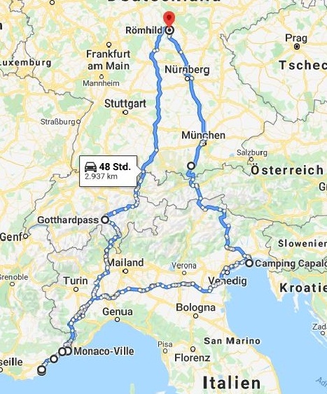 Es dauerte etwa 5 Kaffee, bis wir wach genug waren, gegen 6 Uhr den Motor wieder zu starten und gen Süden zu düsen. Etwas kalt war es so am Rande der Alpen schon noch, so freuten wir uns schon bald, die wärmeren Gelinde Europas zu befahren.