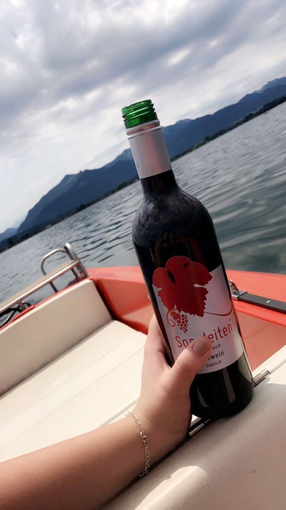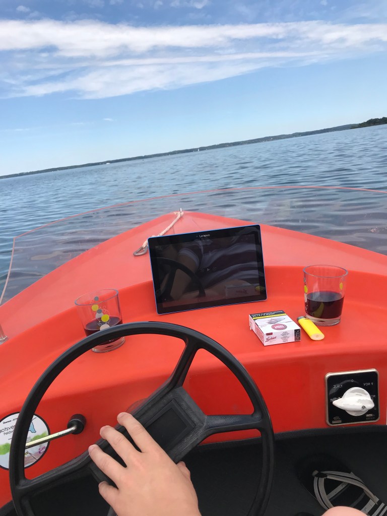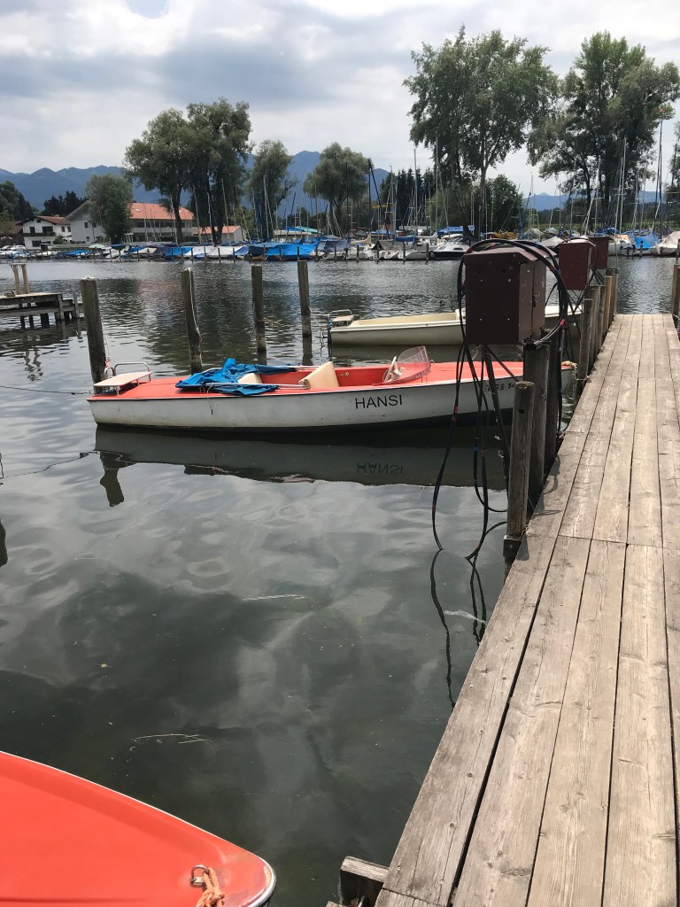 Unser erster Tag am Chiemsee startete bei herrlichen Sonnenschein mit Frühstück vor dem Wohnmobil, bevor wir uns ein E-Boot ausgeliehen haben und über den See gebrettert sind. Auf der Mitte vom See haben wir den Anker geschmissen und eine Flasche Wein aufgemacht, um uns Mut anzutrinken auch mal im eiskalten Wasser baden zu gehen.