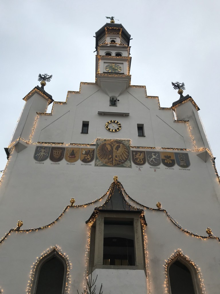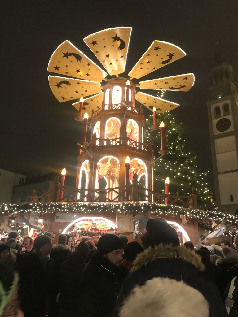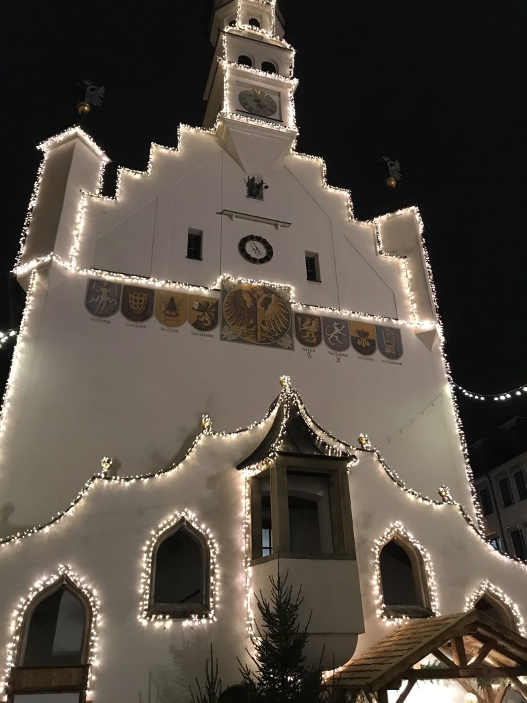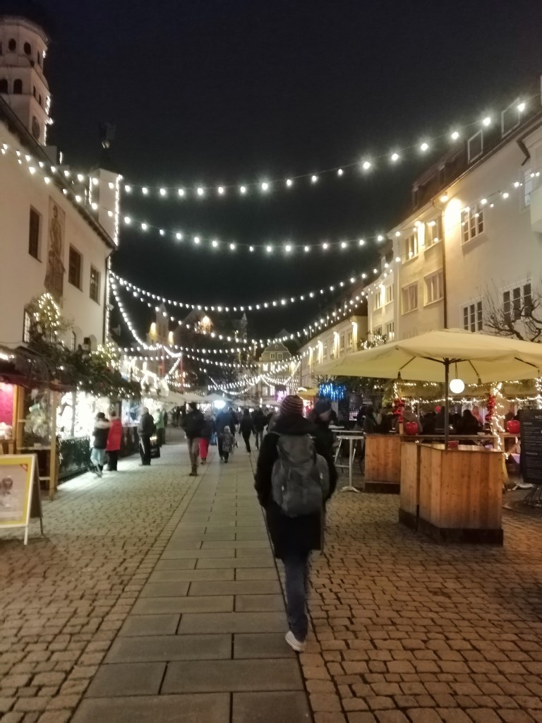 Nachdem wir unser Wohnmobil mit Frischwasser versorgt und die stinkige Brühe entsorgt haben, ging unsere Reise Weiter wieder in Richtung Norden weg von den Alpen. Der nächste Halt sollte Augsburg sein. Hier gibt es einen Stellplatz direkt an der Wertach an der Bundesstraße, ca. 1,5 km vom Ortskern entfernt. Es gibt hier Stromanschluss welchen wir zusätzlich zur Entlastung unserer Gasheizung nutzten. Nach kurzem Verschnaufen vor dem Fernseher gingen wir in die Stadt zum Weihnachtsmarkt. Dieser war aber, wie für die großen Märkte in den Städten bekannt, sehr sehr voll von Menschen. Durch das Gedränge suchten wir uns einen Weg, aber das war doch schon sehr anstrengend im Vergleich zu den vorangegangen urigen Märkten, so dass wir schnell kapitulierten und den Weg nach Hause einschlugen, um uns eine Pizza zu bestellen.