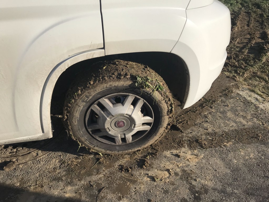 Was wir leider nicht bedachten, das die Sonne während des zweistündigen Besuchs erwachte und die Oberfläche der gefrorenen Wiese innerhalb dieser kurzen Zeit zu einer schmierigen Schlammgegend verwandelte. Kurz nach Betreten der Wiese dachte ich mir schon, das jetzt Unangenehmes folgen sollte, doch versuchen wollte ich es trotzdem, denn heute sollte es noch zum Nürnberger Christkindls Markt gehen. Doch bereits der kleine Anstieg zum Wirtschaftsweg reichte, das sich das Wohnmobil einbuddelte und nun auch langsam auf der Hinterachse einsank, da half auch vereintes Schieben nichts, bei 3,5 to im Schlamm. Gott sei Dank ist das Neubaugebiet wie anfangs beschrieben noch eine große Baustelle, so entdeckte unsere kläglichen Versuche und unsere resignierten Gesichter so gleich ein hilfsbereiter Baggerfahrer, der Gott sei Dank auch einen Schlupf mit an Bord hatte. Der Kettenbagger hatte keine Mühe, unser Wohnmobil am Hintern zu packen und aus dem Morast wieder auf die geteerte Straße zu buchsieren, so dass wir unser mit Schlamm und Dreck eingesautes Auto gleich auf die Straße in Richtung Nürnberg bewegen konnten.