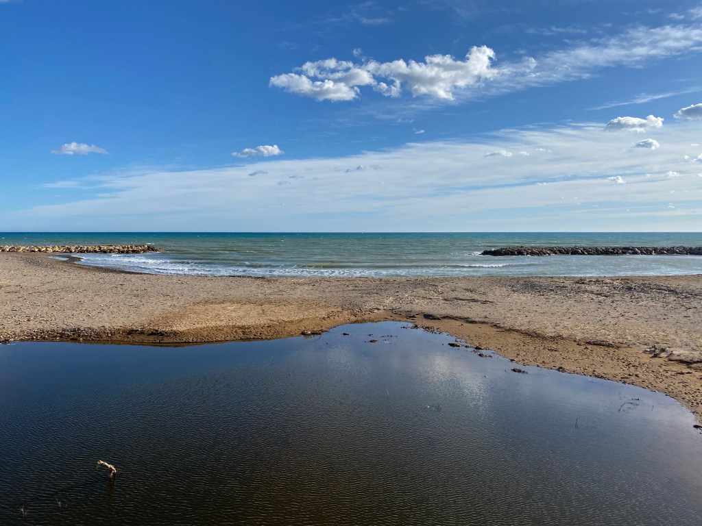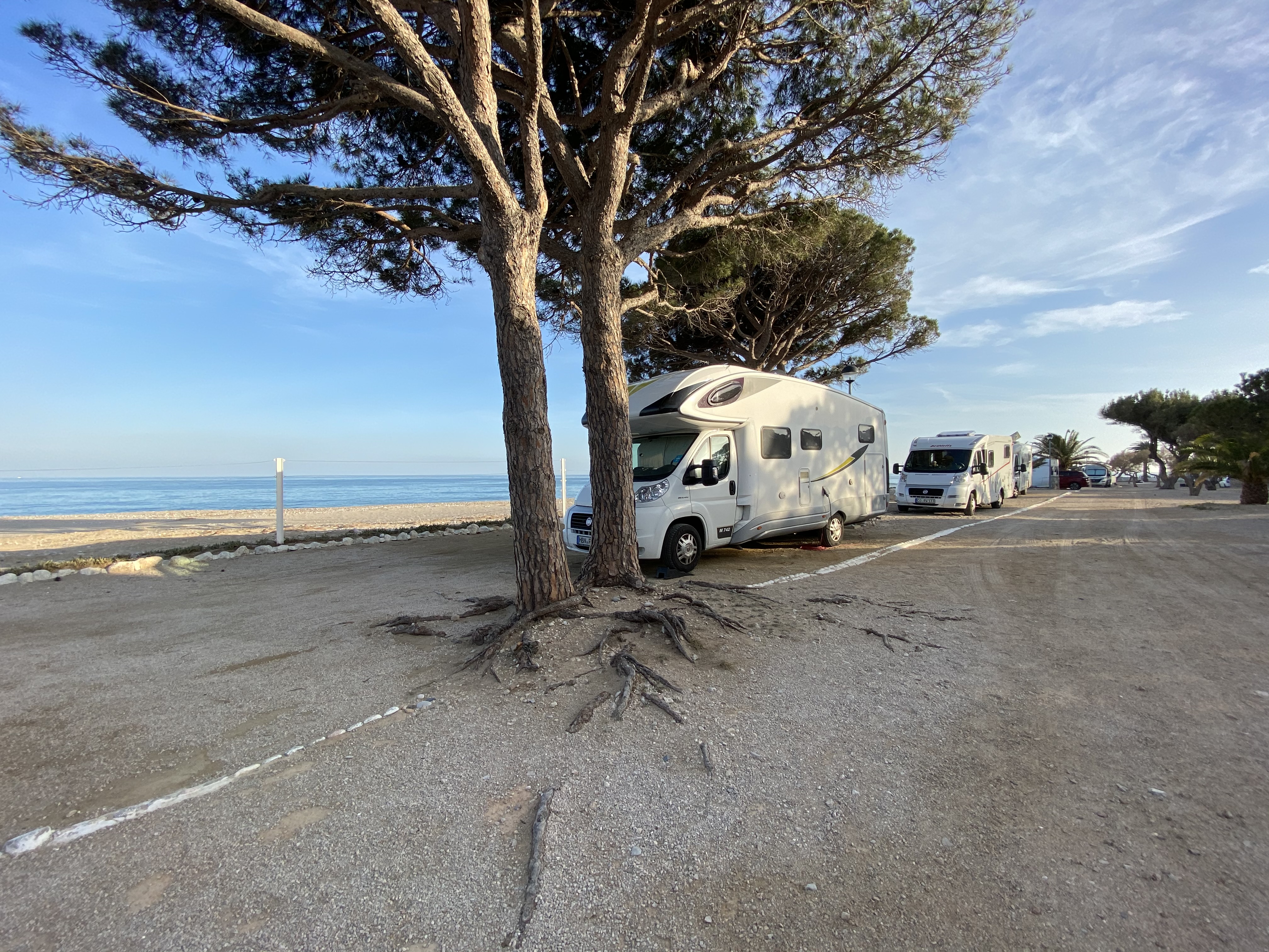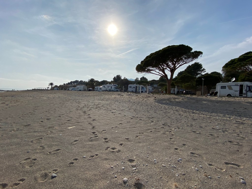 Am Mittwoch wollten wir wieder circa 100 Kilometer nördlich ziehen, damit wir selbst als Langschläfer und Abfahrt gegen Mittag noch möglichst viel vom Tag haben. Nach der wiederrum sehr schönen Fahrt der Küste entlang kamen wir in Cabanes an, um uns dort nach einem Stellplatz umzuschauen. Die zahlreichen Campingplätze aber präsentierten schon von weiten mit Schildern vor den Einfahrten, dass sie ausgebucht sind. Nach zahlreichen Versuchen doch noch ein Plätzchen hier zu finden gaben wir auf und entschlossen uns noch weiter Richtung Norden zu fahren. Wir telefonierten mit einigen Plätzen entlang der Küste, viele waren Saisonbedingt geschlossen, andere waren ebenso ausgebucht wie die in Cabanes. Irgendwann hatten wir Glück bei einem, in der Nähe der vor einigen Tagen besuchten Gegend rund um Cambrils, genauer gesagt in L’Hospitalet de l’Infant. Und was für einer, mit direkter Lage und freier Sicht aufs Meer pltzierten wir unseren PLA längs des Strandes, um von der Veranda einen herrlichen Blick aufs kühle Nass zu erhaschen.