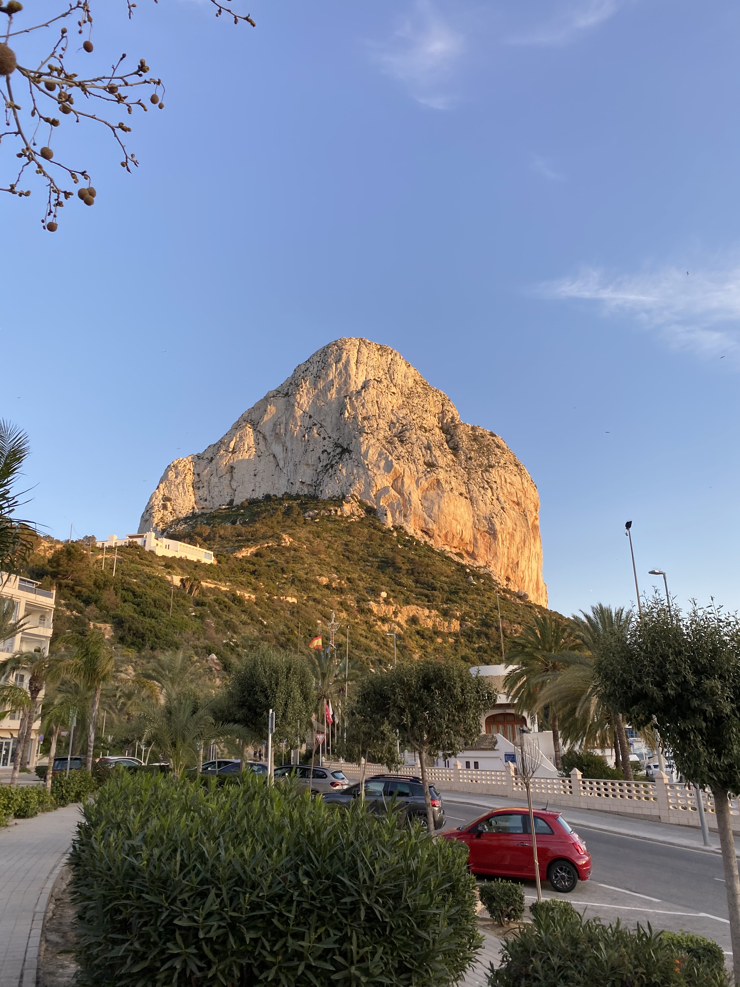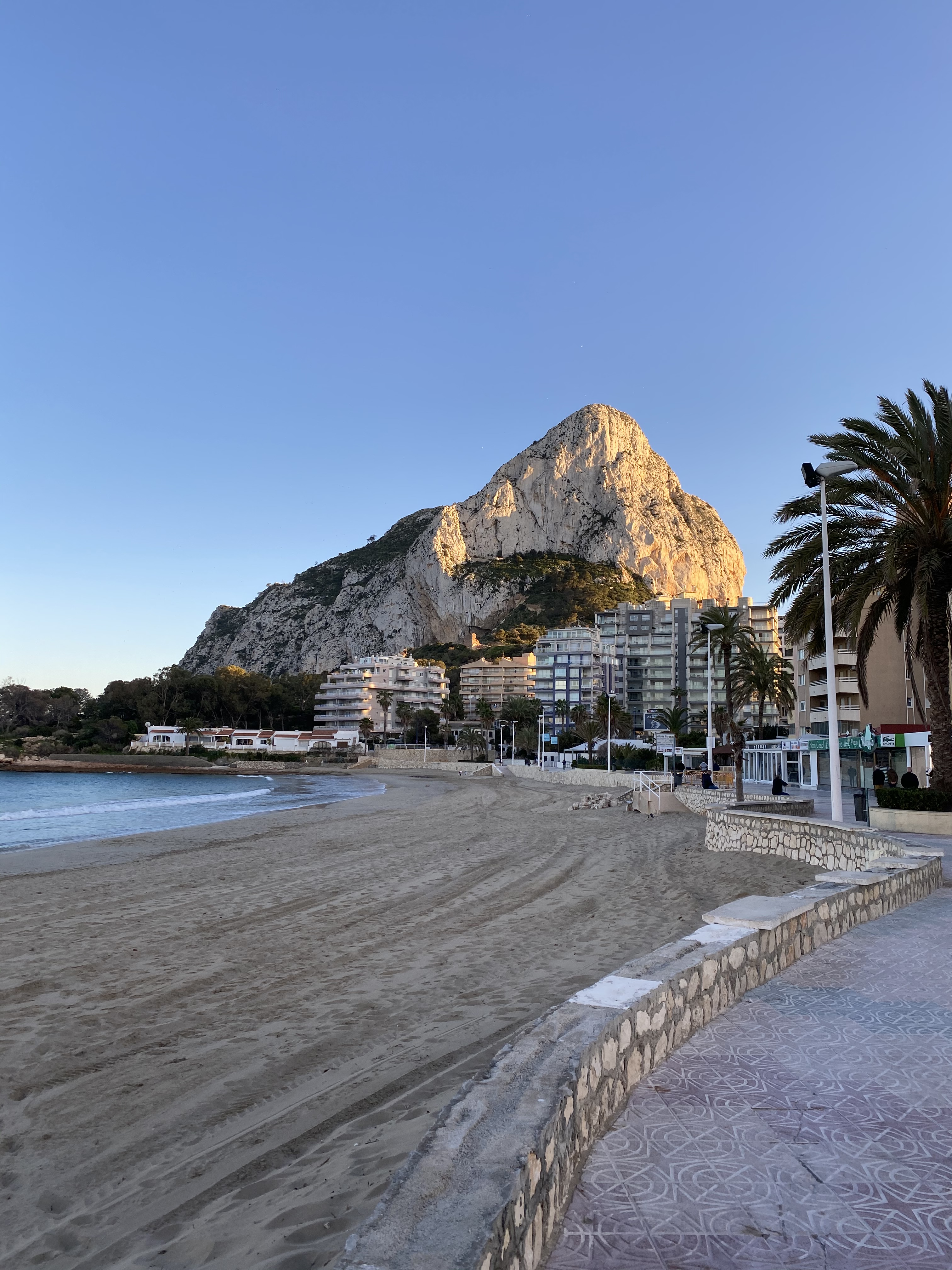 Danach machten wir Frühstück und vertrieben uns die Zeit bis angenehme Badetemperaturen auf dem Thermometer zu lesen waren mit Fernsehen, genauer gesagt deutsches Frühstücksfernsehen. Dem aufmerksamen Leser ist vielleicht bereits aufgefallen, das wir uns um die Zeit Anfang März 2020 befinden, die Zeit die überdramatisierenden als der Krisenbeginn in der Corona Pandemie in die Geschichtsbücher eingehen wird. Da wir durch den verkorksten zweiten Tag leider kein Radio mehr hatten und wir bis dato wenig bis keine Zeit uns nahmen im Fernsehen oder auf sozialen Medien Nachrichtentechnisch uns auf den neusten Stand zu bringen, erfuhren wir morgens diesen Tages erst über die flächendeckende Ausbreitung des Corona Virus. Gut, zunächst war es nicht wirklich besorgniserregend, aber ein paar Gedanken machten wir uns trotzdem. Nach diesen neuen Erkenntnissen verbrachten wir einen herrlichen Badetag am Strand von Urbanova. Interessant ist hier auch der angrenzende Flughafen, der uns nachts nicht auffiel, aber durch den wir am Tag viele tieffliegende dem Landeanflug beginnende Flugzeuge bestaunen konnten. Gegen Abend brachen wir aber dennoch auf, um wieder ein Stückchen weiter in den Norden zu fahren. Unser nächstes Ziel ist Calp, auch eines der Touristen Highlights an der Spanischen Küste. Hier wählten wir einen kleinen Campingplatz zentral gelegen namens Camping Sol de Calpes. Die Campingplätze sind alle erstaunlicherweise gut ausgelastet, dennoch hatten wir auch hier keinerlei Probleme einen Platz auf dem geschotterten Gelände zu bekommen. Die Sanitären Anlage waren wie auf der gesamten Reise in Ordnung. Das Städchen Calp bietet als Hauptattraktion ein wahrliches Naturphänomen. Ein Riesiger Stein ragt unwirklich aus dem Wasser heraus. Für den Betrachter ein sehr eigenartiger und doch majestätischer Ausblick. Die Stadt selbst lebt aber auch hier von Saison Tourismus, weswegen im März trotz der vielen Überwinterer keinerlei Spur von geöffneten Gastronomien oder Bummelmärkten war. Die Nachfrage scheint wohl trotzdem nicht groß genug zu sein, um auch im Winter ein profitables Geschäft einzufahren.