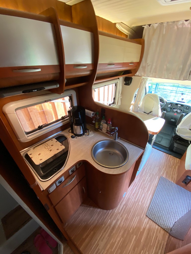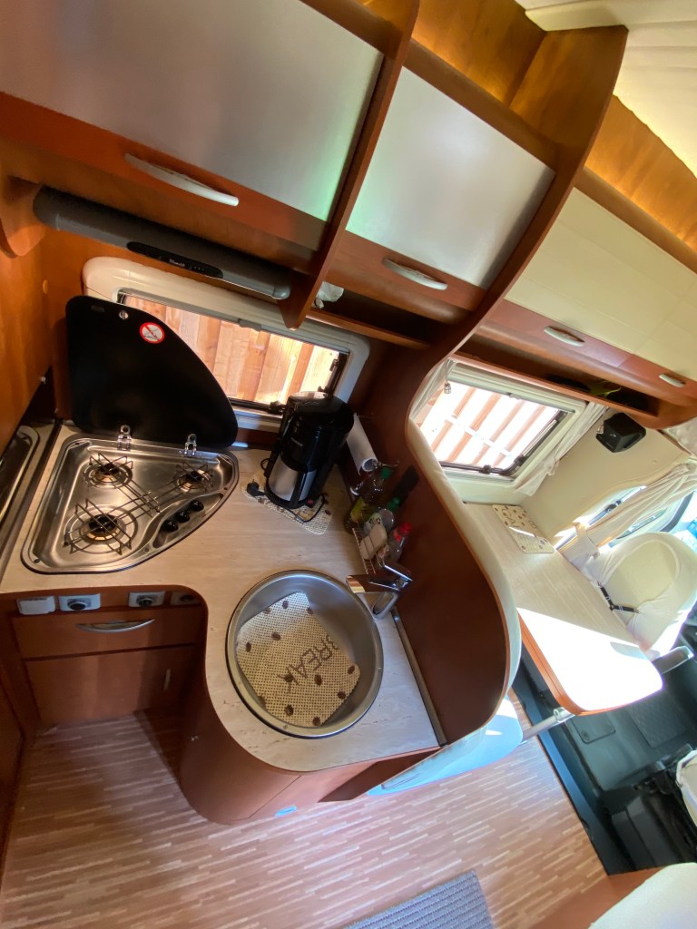 Da wir gute Esser sind, darf natürlich auch hier eine richtige Küche nicht fehlen. Natürlich ist kein 5-Sterne Menü machbar, aber die meisten Gerichte lassen sich im Handumdrehen auch hier zaubern. Ausgestattet sind wir mit einem 3 Flammen Kochfeld mit Dunstabzug, einer großen Spüle, Kaffeemaschine und einer großen Kühl-Gefrierkombination. Ebenfalls immer mit dabei haben wir einen Toaster, einen Wasserkocher und einen Eierkocher. Und wenn alle Stricke reisen, haben wir als Outdoor Küche noch einen kleinen Kugelgrill mit an Bord. Einzig allein kocht ab und an auf Achse der Wunsch nach einem überbackenen Auflauf oder einem frisch gebackenen Kuchen hoch, ein Ofen fehlt leider noch. Aber was nicht ist, kann ja noch werden. Und auch ohne Ofen – verhungert sind wir bisher noch nicht auf Reisen!