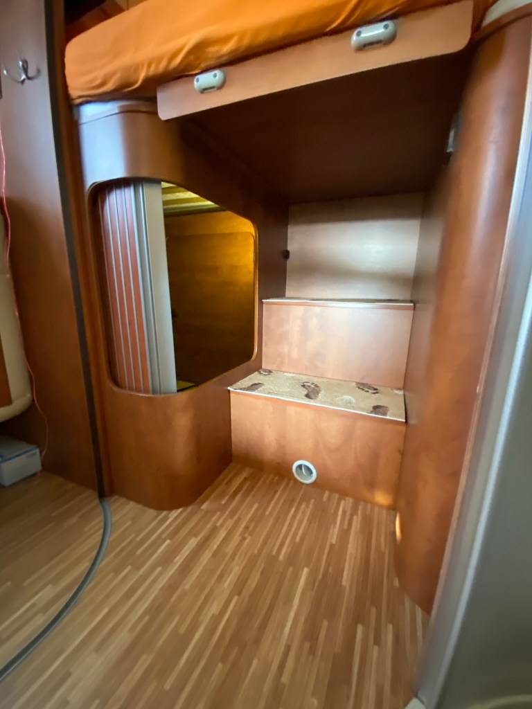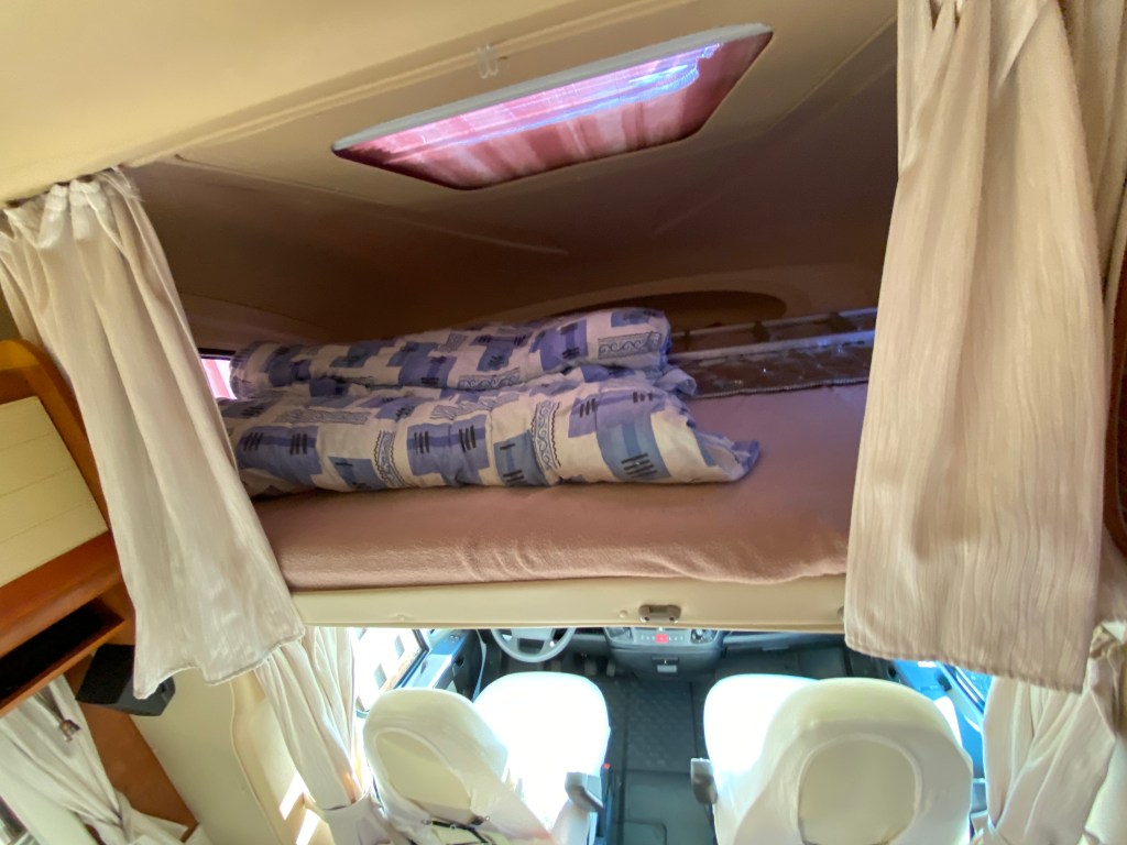 Die Alkove bietet bei Reisen zu zweit einen wunderbaren großen unordentlichen Stauraum, der gut mit den Gardinen versteckt werden kann. Auch eine Steckdose ist in der Seite integriert. Als zusätzliches Bett für zwei weitere Personen ist es über eine Leiter zu erreichen, es bietet ausreichend Platz für einen normalen Schlaf, jedoch sollte man von anderen Aktivitäten aufgrund der niedrigen Deckenhöhe absehen.
