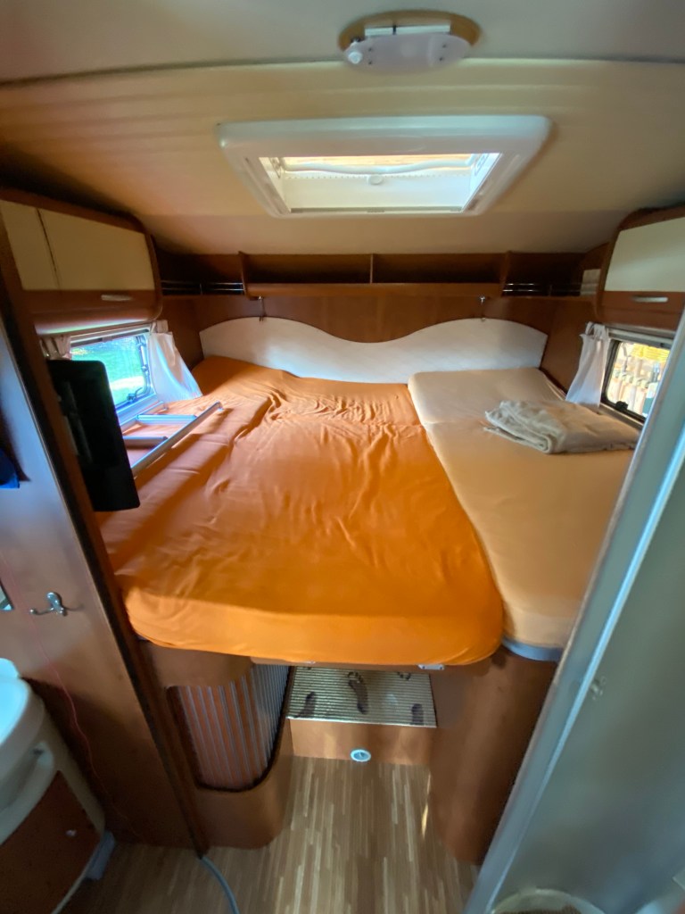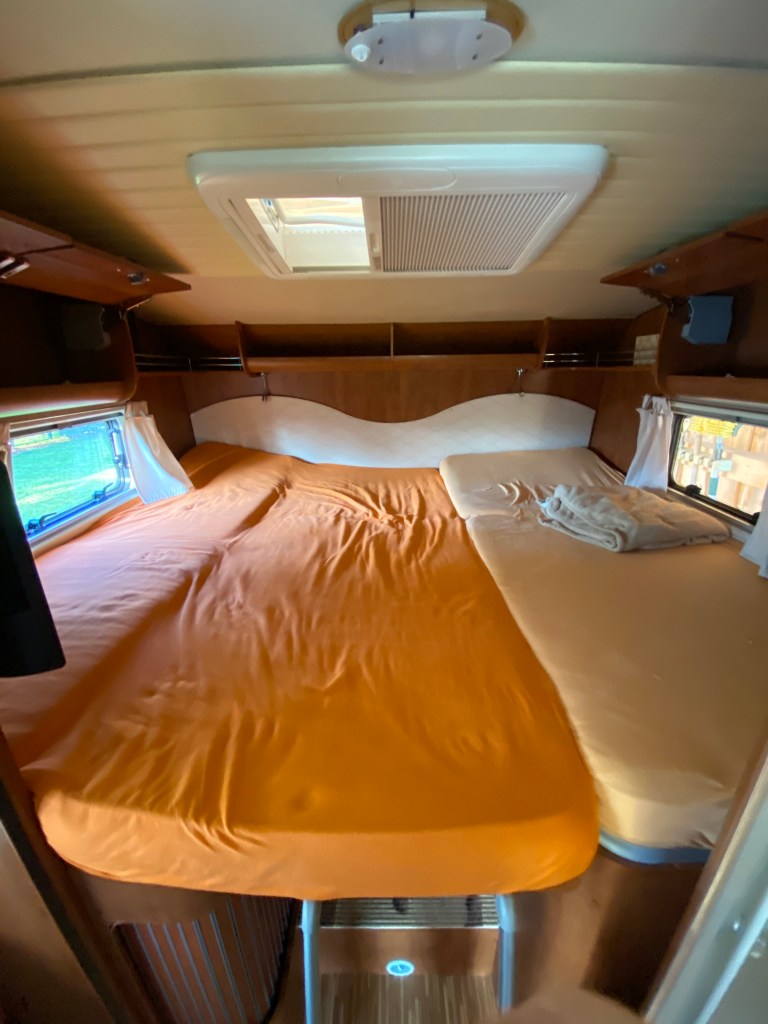 Das große Bett im Heck ist ca. 230×200 und somit eine wahre Kuschelhöhle. Hier lässt sich der Abend wunderbar ausklingen bei einem Film, bevor man dank der absoluten Verdunklung an den Fenstern bis weit über den Sonnenaufgang hinaus tief und fest schlummern kann.
