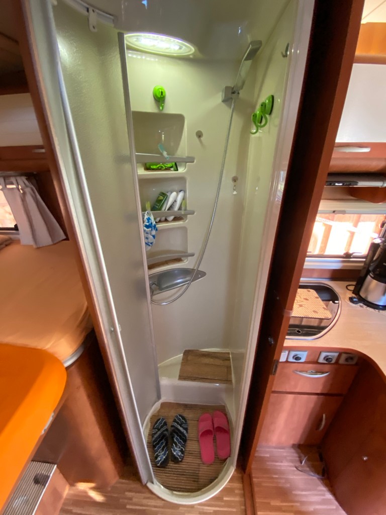 Unser kleines feines Bad ist zwar kein Raumwunder, aber doch haben wir hier alles was man braucht, um gerade auch autark im Nirgendwo stehen zu können. Damit das WC nicht bei jeder Duscheinheit von einer großen Sinnflut überspült wird, ist bei uns die Dusche räumlich getrennt, was für uns einen großen Vorteil darstellt. Das WC hat ein Fassungsvermögen von 10 Litern, also rund 20 kleine Einheiten oder 10 große und könnte auch räumlich abgegrenzt werden. Ein kleines Waschbecken und diverse Schränkchen runden das ganze ab.
