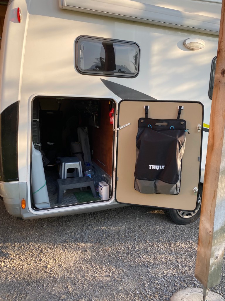 Die Heckgarage nutzen wir für allerlei Sachen. Zum einen haben wir ein Regal eingebaut, welches zusätzlichen Stauraum für sämtlichste kleine Dinge bietet. Ebenfalls haben wir hier Platz für Campingstühle und Tische, Werkzeugkasten, Stromkabel und Getränke. Bei kleinen Touren können wir auch mal unsere Fahrräder darin verstauen.
